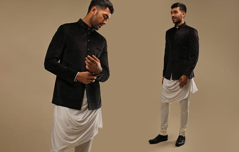 The cowl-look and the bandi jacket is cool this season. Men are breaking the stereotype and opting for a twisted and edgy pattern to stand out from the crowd. We bet you would be the talk of the town and a subject of envy wearing this fancy men’s kurta set. Actors like Ayushman Khurana and Varun Dhawan are often spotted in ethnic as well as funky fusion kurta sets.