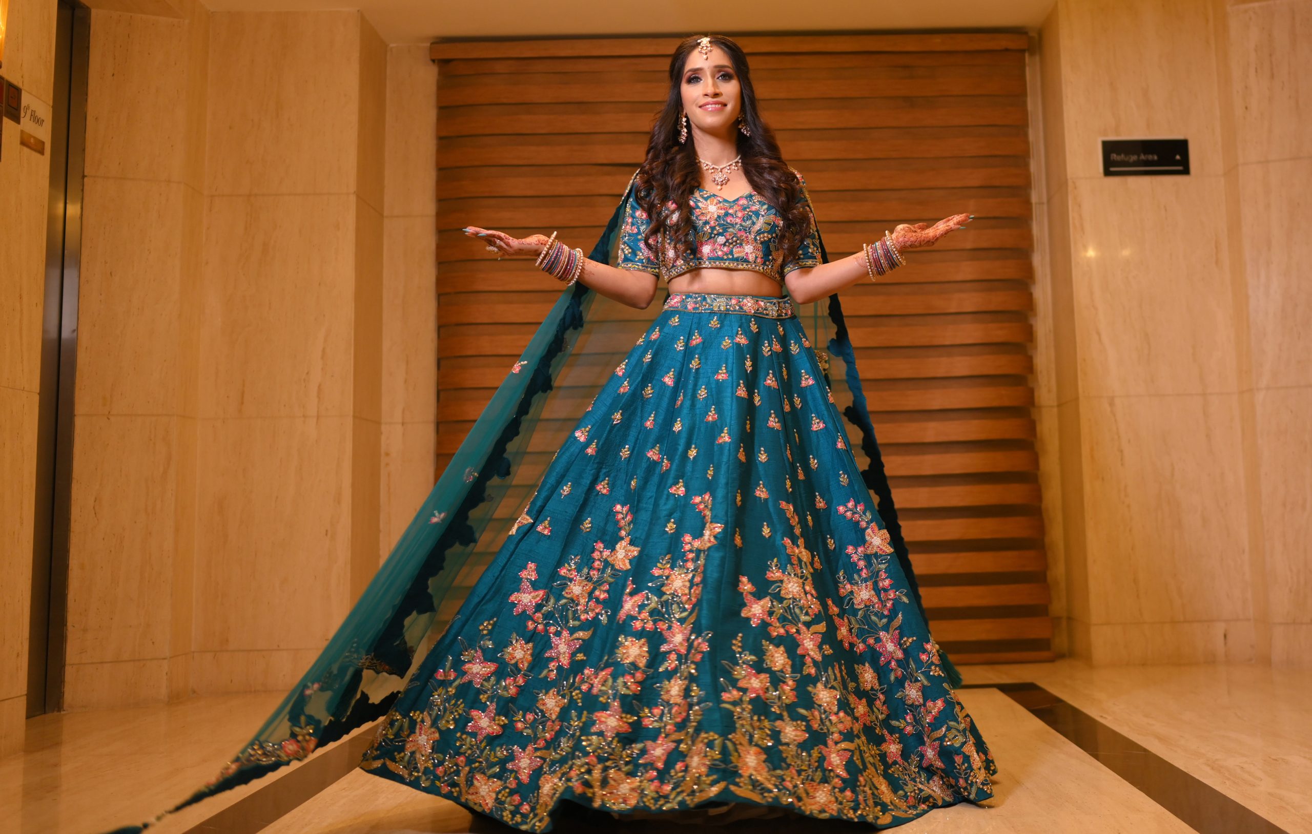 Can you imagine my excitement level on achieving the Disney princess look? Well, it was another level. The scintillating lehenga choli in raw silk with colourful resham cut dana,moti, and sequins embroidery was exquisite and alluring. The intricately embroidered spring blossoms and floral buttis were the highlights of the wedding reception dress. The lehenga was paired with a gorgeous, embroidered net dupatta. My look was complete with a dazzling necklace set, a maang tikka, and matching bangles. The glossy makeup along with loose curls added extra charm to the bridal look. My better half looked dapper in a grey suit and together we looked like a rocking couple.