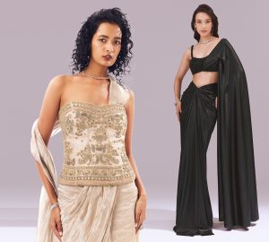 A chic outerwear adds more elegance to the outfit. Short or long jackets and shrugs worn with Punjabi suits look great as semi formal outfits. Grab a silk simple crop top with a royal blue cape jacket adorned with zari and sequin work. The cape jacket is further attached with a tassel motif. You can match the dress with fancy dhoti pants.