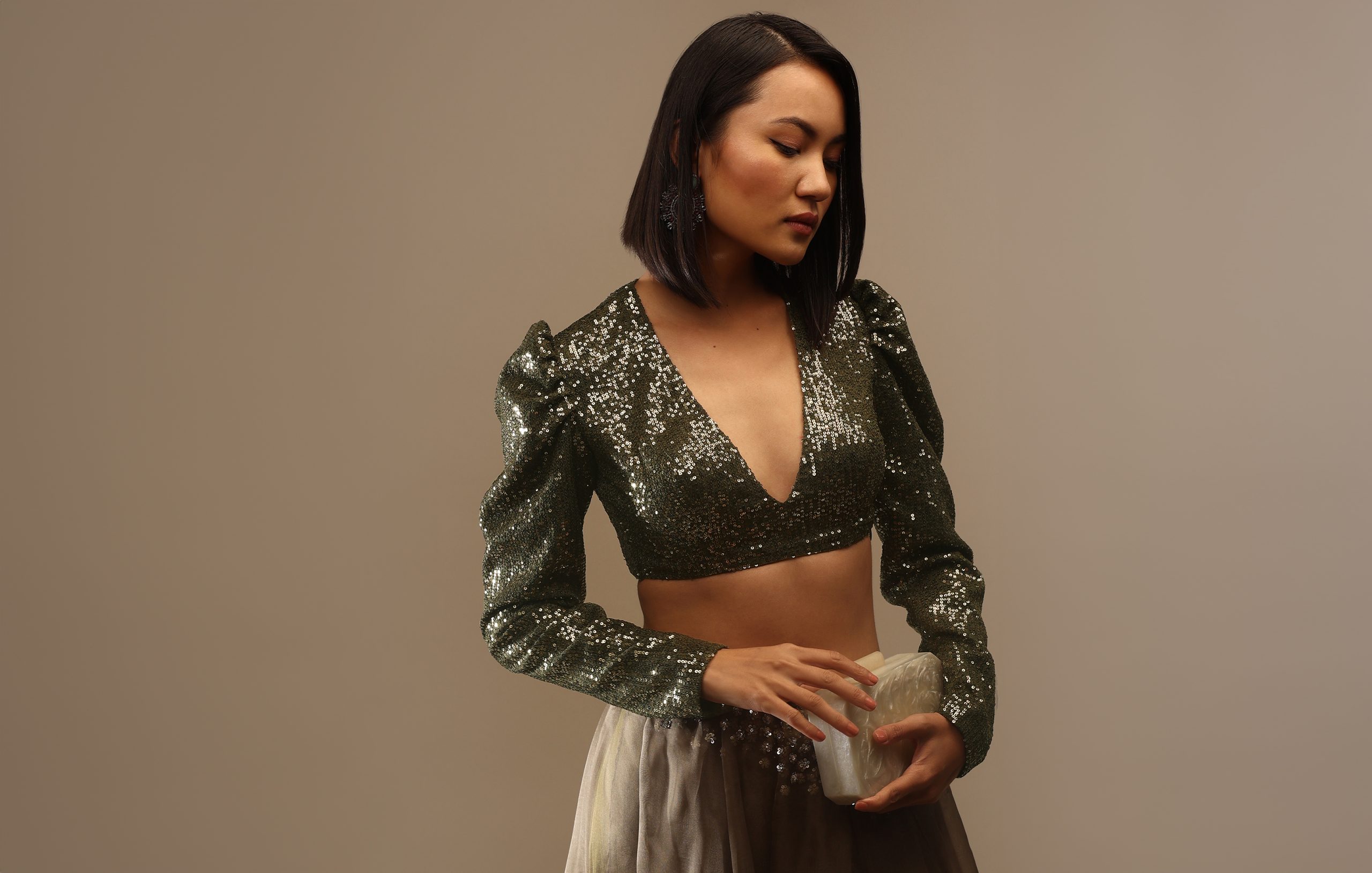 This full-sleeve blouse design is what the whole party will be talking about. Featuring a sparkly sequins blouse, for your glamour-filled night, when you want all eyes on you. Style it with a simple saree for that classic glam vibe.