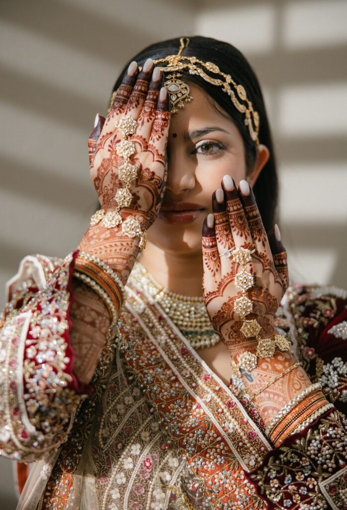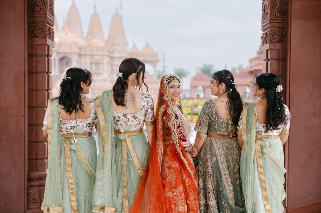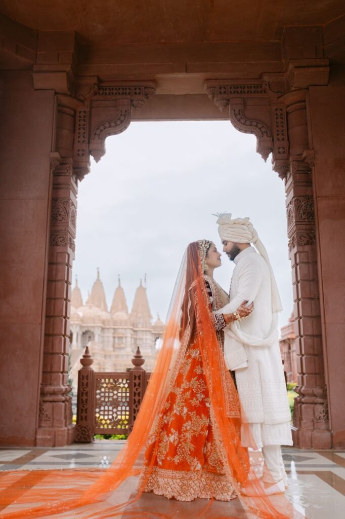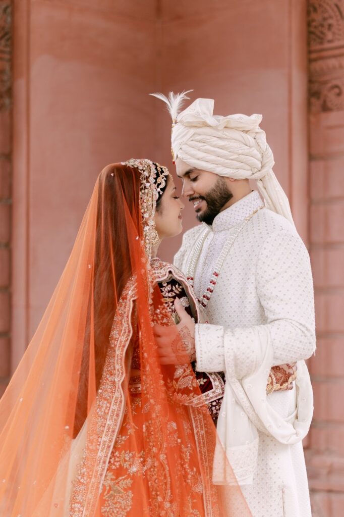 While red has long been the traditional choice for Indian brides, many modern brides are embracing alternative shades that still carry cultural significance. For Rhea, the choice of a vibrant orange lehenga felt both meaningful and refreshing.