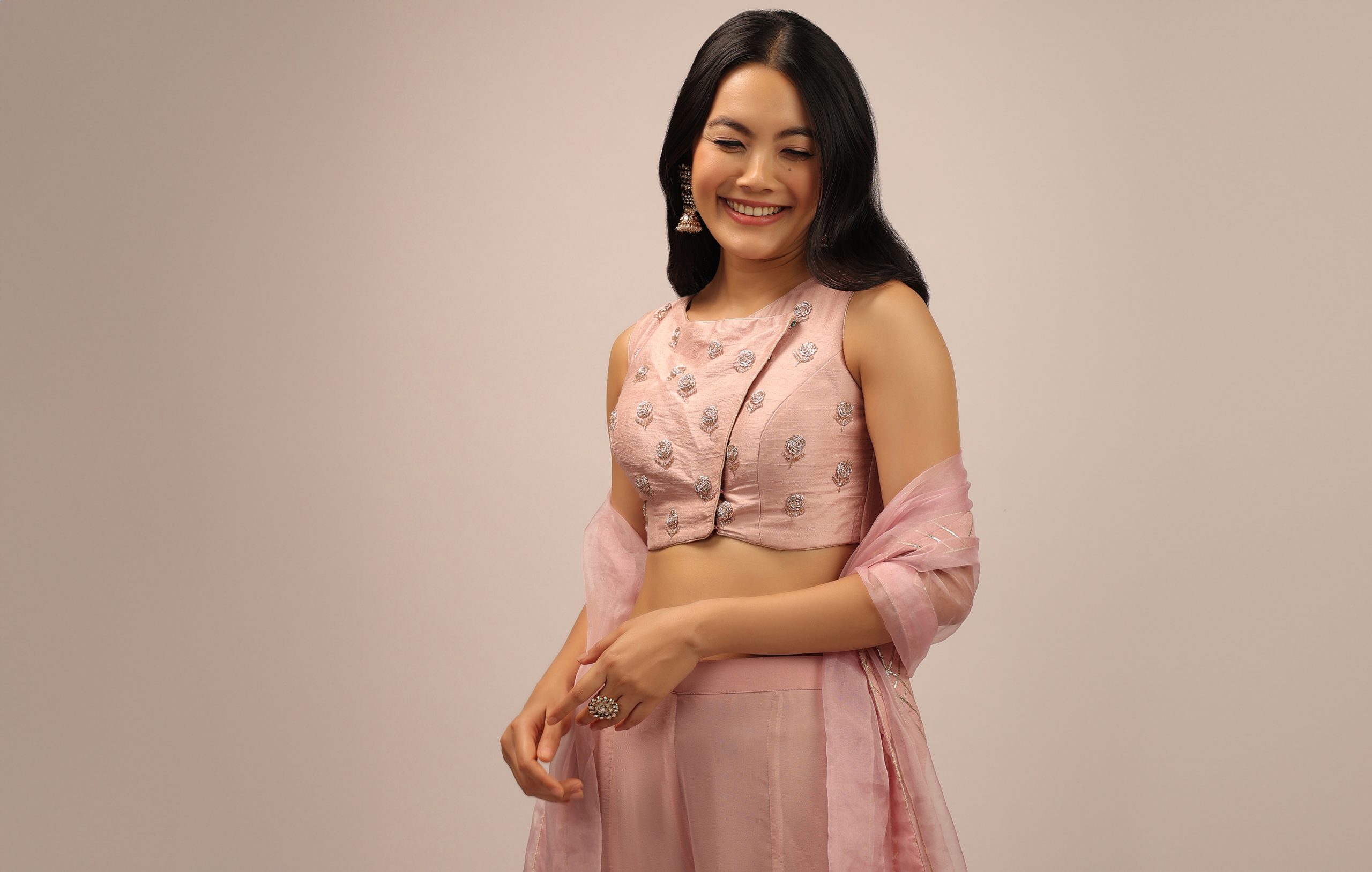 Discover the pinnacle of elegance and style with a flattering wrap-around blouse. A pink floral embroidered blouse with a wrap or overlap design can be paired with a beige or golden silk saree to create a stunning combination. You can also style it with an Indo-western saree and cowl pants for a trendy twist. You can vouch for a traditional appearance, or a chic fusion look in pink, black, and white embroidered blouse in similar patterns.