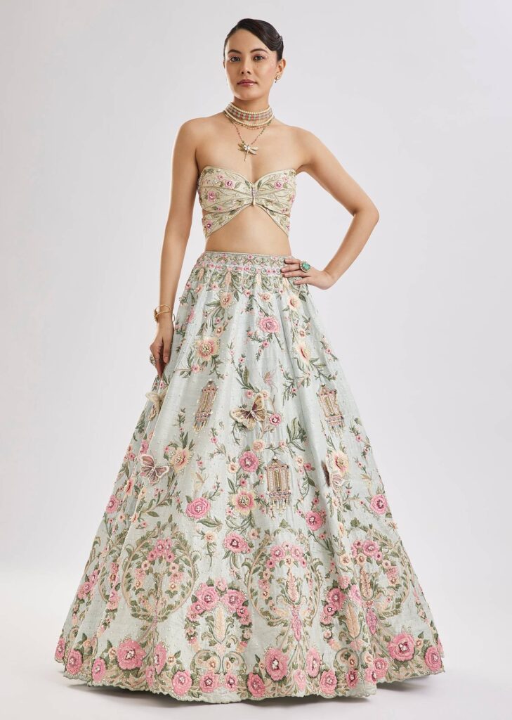 Fabrics like velvet, brocade, and silk give a royal look and are apt for traditional weddings while organza, georgette, and chiffon look awesome during summers and are apt for outdoor weddings.