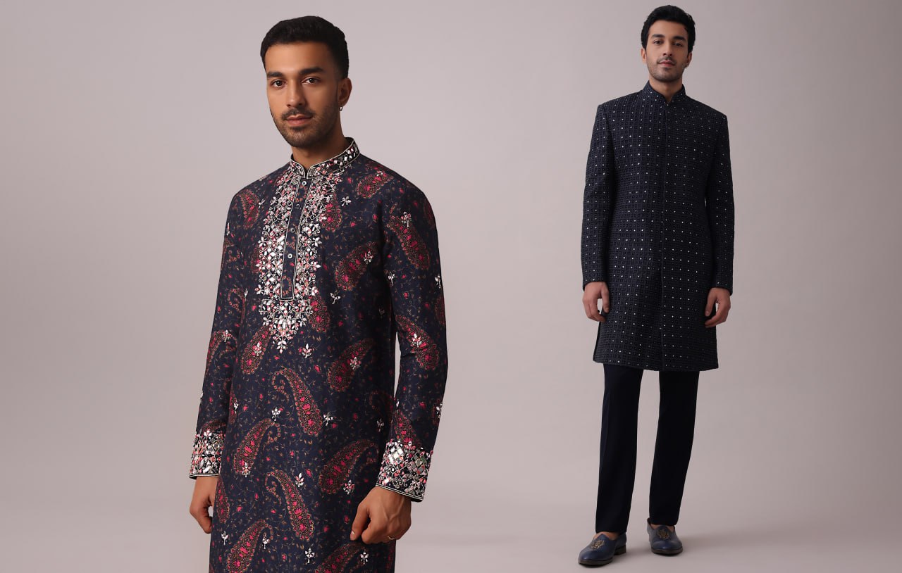 No matter how much you look for minimalistic designs; the full-blown maximalism with mirror details has its charm. And why not? Embellishments like mirrors, chikankari, thread work, and cut-dana are bespoken of India’s rich past, culture, heritage, and royal clothing. Grooms-to-be can count on KALKI for black mirror kurta for men, chikankari mirror work kurta men, and cotton mirror work kurta for men. Latest heavy work kurta for men, Indo-western sherwanis, and festive kurtas that resonate with the fashion statement of ancient emperors are also available at KALKI Fashion.