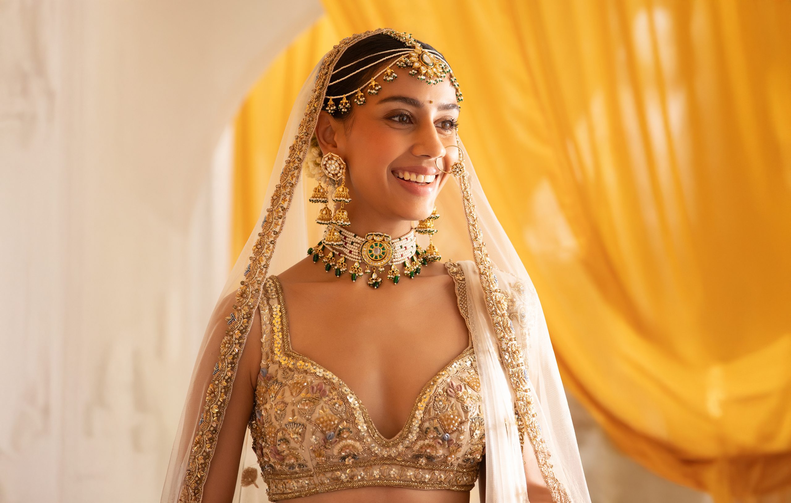 - Captivating chokers, long necklaces, jhumkas, maang tikka: Dazzle and shine as you adorn polki, kundan, diamond jewellery like chokers, necklaces, bangles, maang tikka, jhumkas, rings, etc, with your bridal outfits and look like a princess. Make sure your jewellery is in sync with the embroidery and the colour of your bridal outfit for a harmonious look.