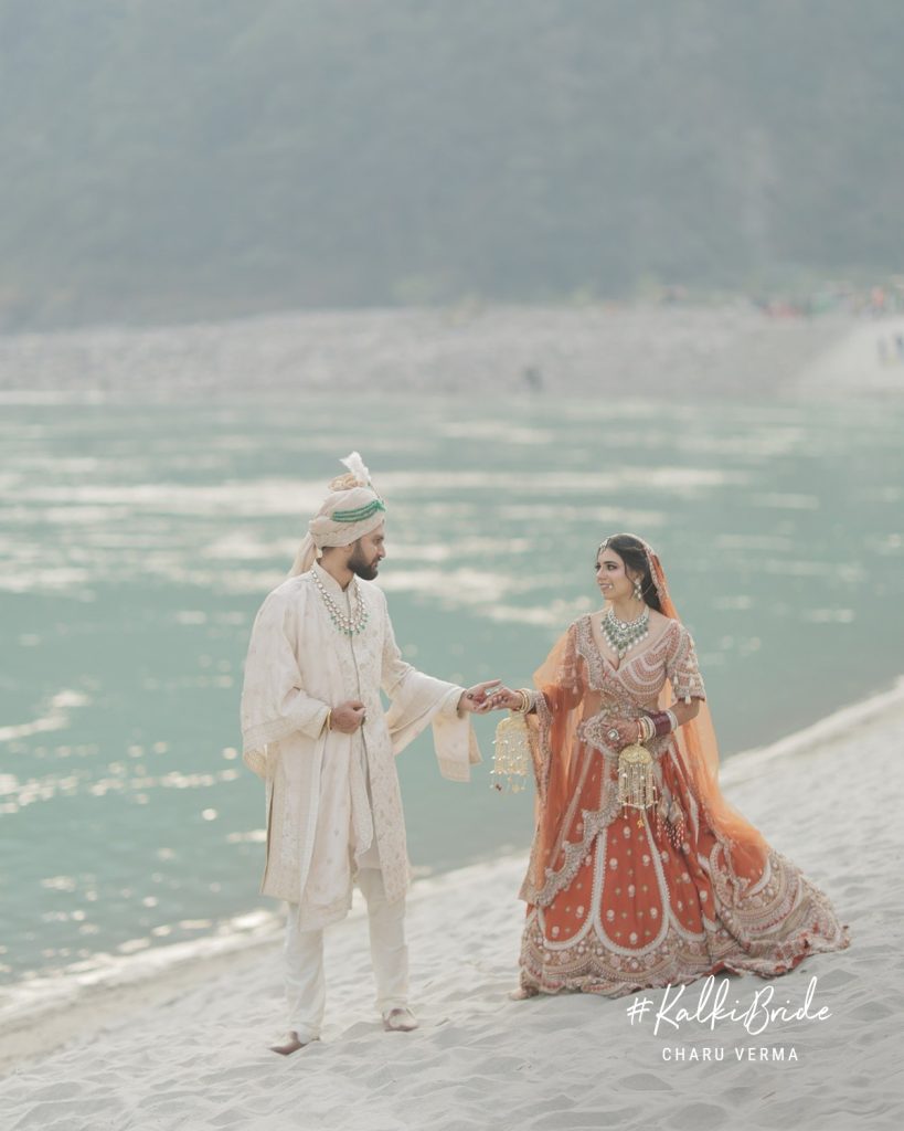 Fast forward to 2025, and that quiet love had grown into a shared life. With families involved and wedding plans underway, Charu and Rishi found themselves planning a destination wedding in Rishikesh while living in New York. The distance made every decision intentional. Multiple designers were explored, countless lehengas were tried, and many colors were considered, yet nothing felt quite right.