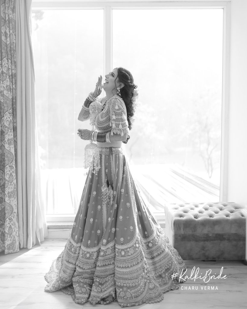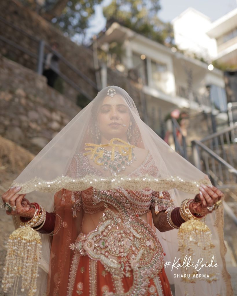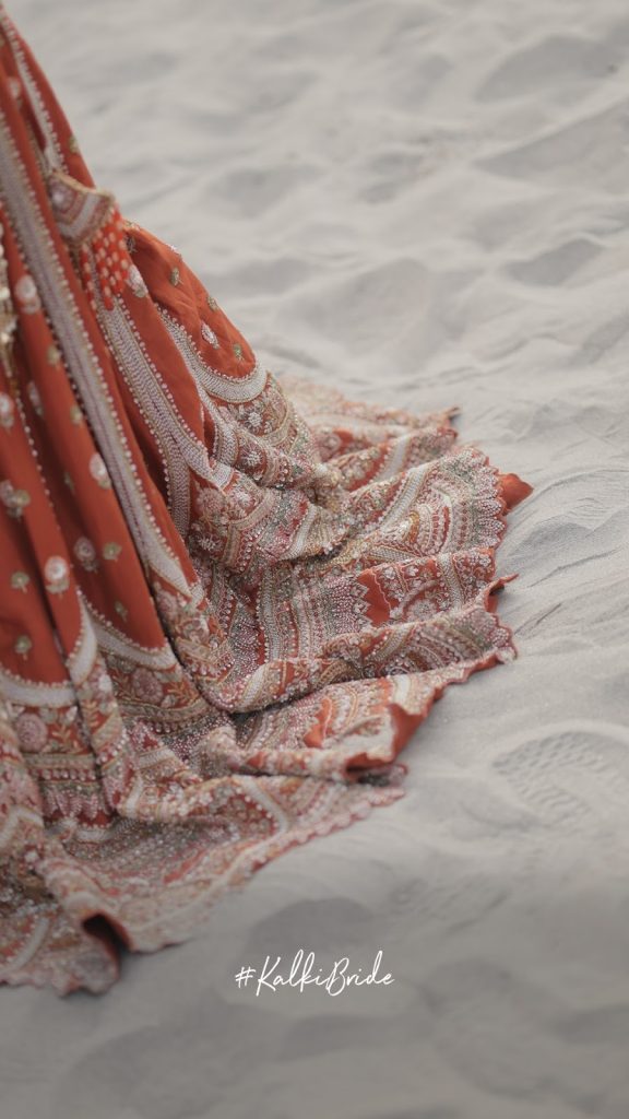 It happened during a casual video call with a Kalki representative. While browsing Kalki’s affordable bridal collection, her eyes stopped on a burnt orange lehenga, instantly. She didn’t know she was looking for it, but she knew it was meant for her.