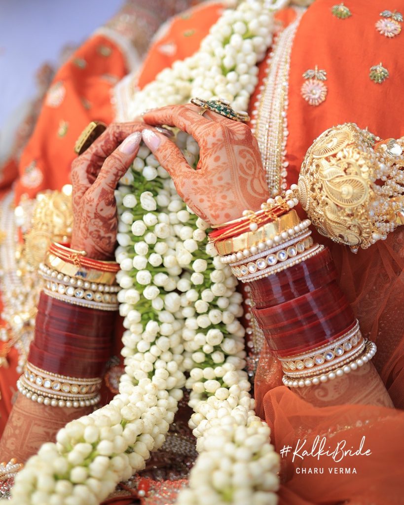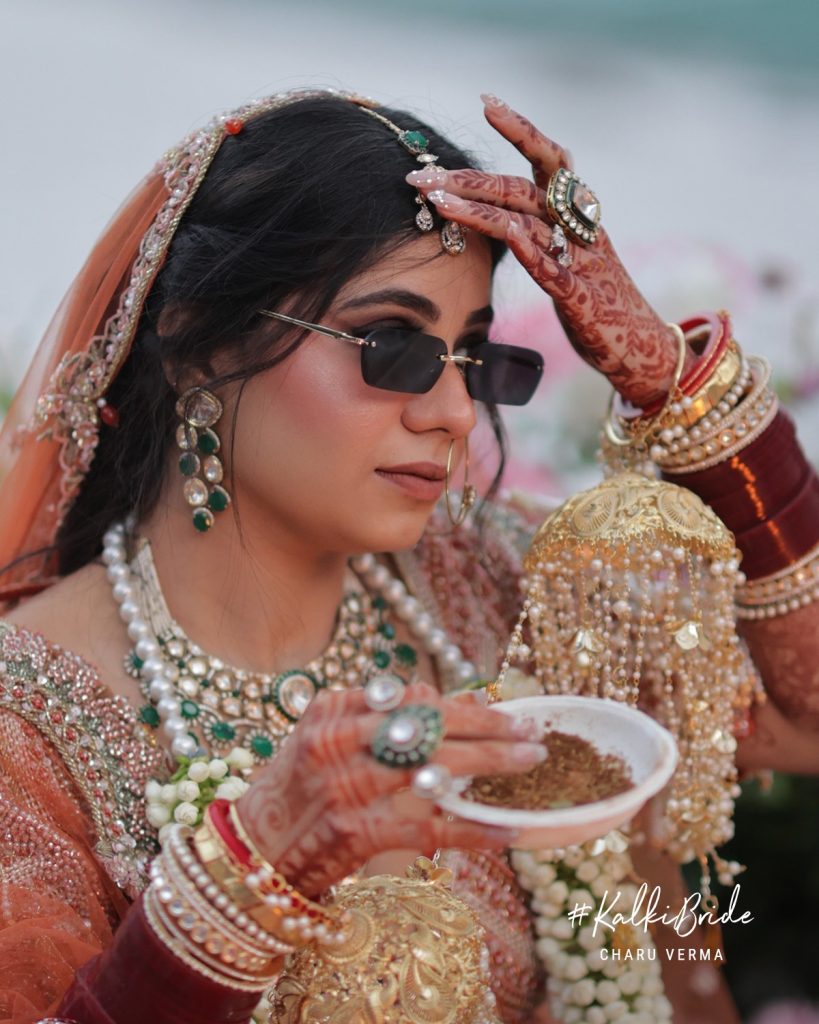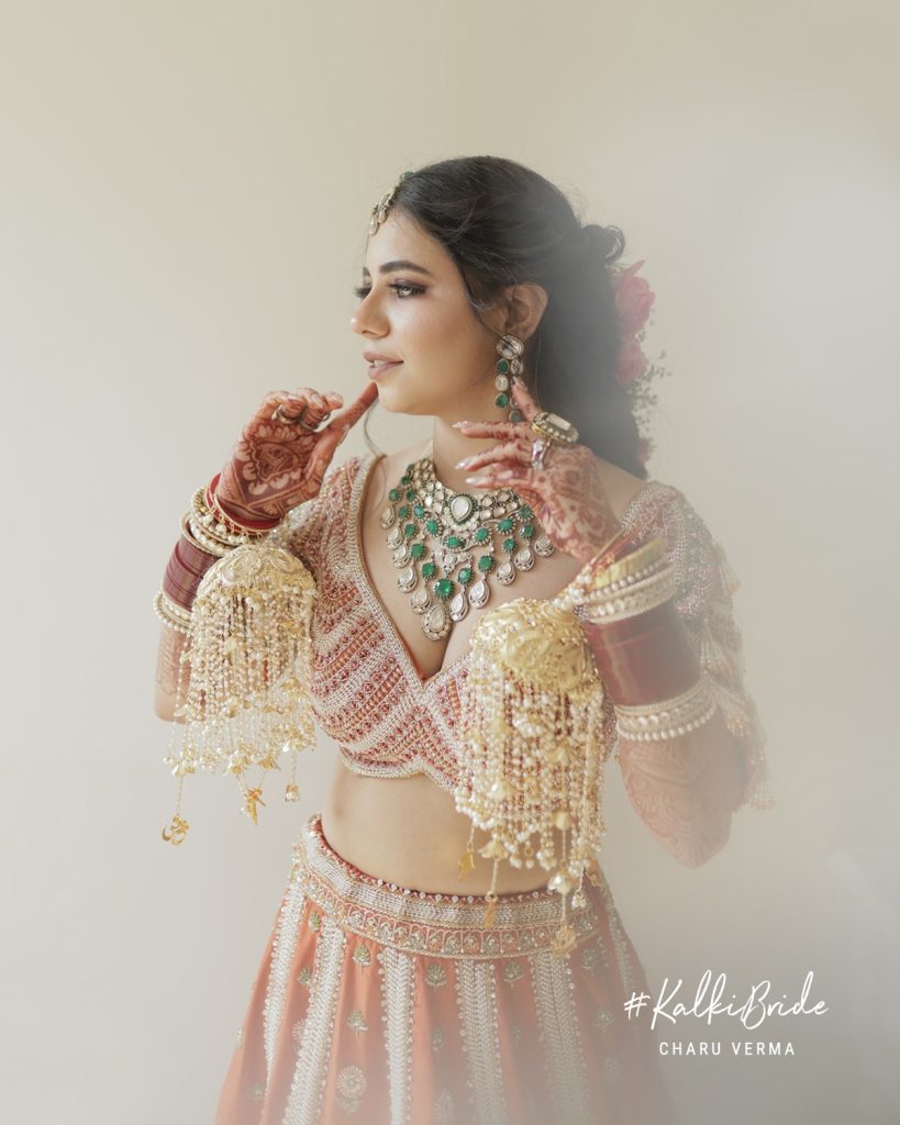 Every element of Charu’s bridal look was curated to complement the lehenga. Layers of pearls and emeralds added freshness against the warmth of the burnt orange. A traditional nath framed her face, while choodas, kalire, and intricate mehendi completed the look without overpowering it.
