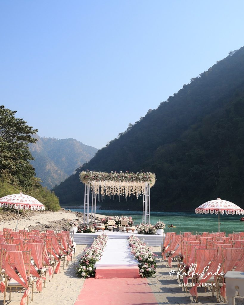 Set against the sacred banks of the Ganges, the wedding unfolded amidst soft river sands, misty hills, and gentle sunlight. The décor was intentionally understated, white florals cascading overhead, delicate installations swaying in the breeze, and pastel blooms grounding the mandap.
