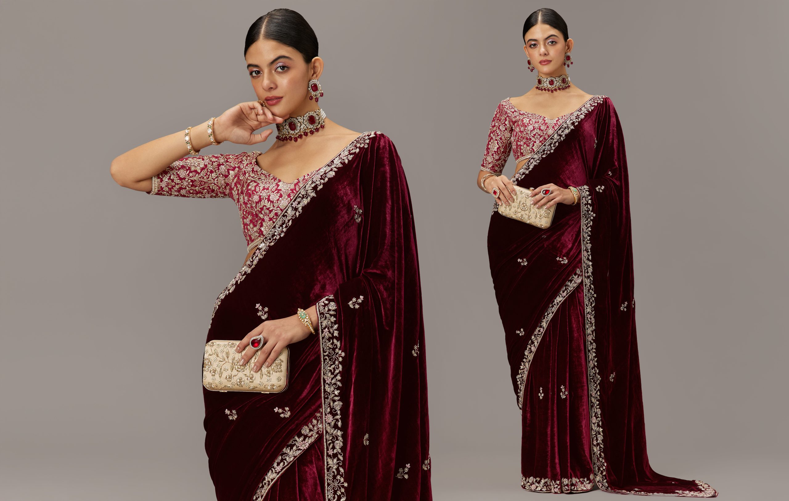 Maroon Velvet Saree With Brocade Embroidery: This one’s got to be in your checklist, an elegant traditional velvet saree is ideal for civil ceremonies or intimate rituals. The velvety smooth shines in daylight, while the beautiful golden motif detailing provides just the right amount of pizzazz. Match it with a sleek bun and dainty pearl accessories. A simple bridal look yet so elegant, can be a remembrance of sophistication and elegance for a modern bride.