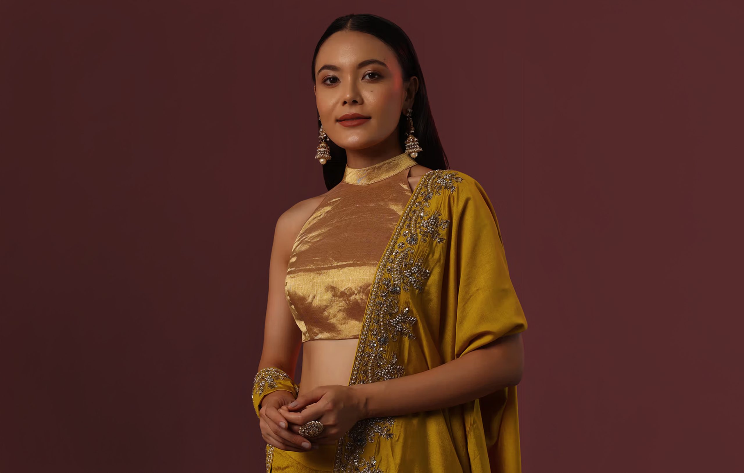 Break the monotony with an asymmetric sleeveless blouse. Its unorthodox silhouette will be best paired with contemporary sarees featuring bold patterns or geometric prints. Perfect for fusion-themed events, it’s a quirky take on traditional dressing.