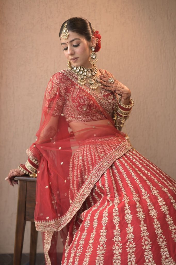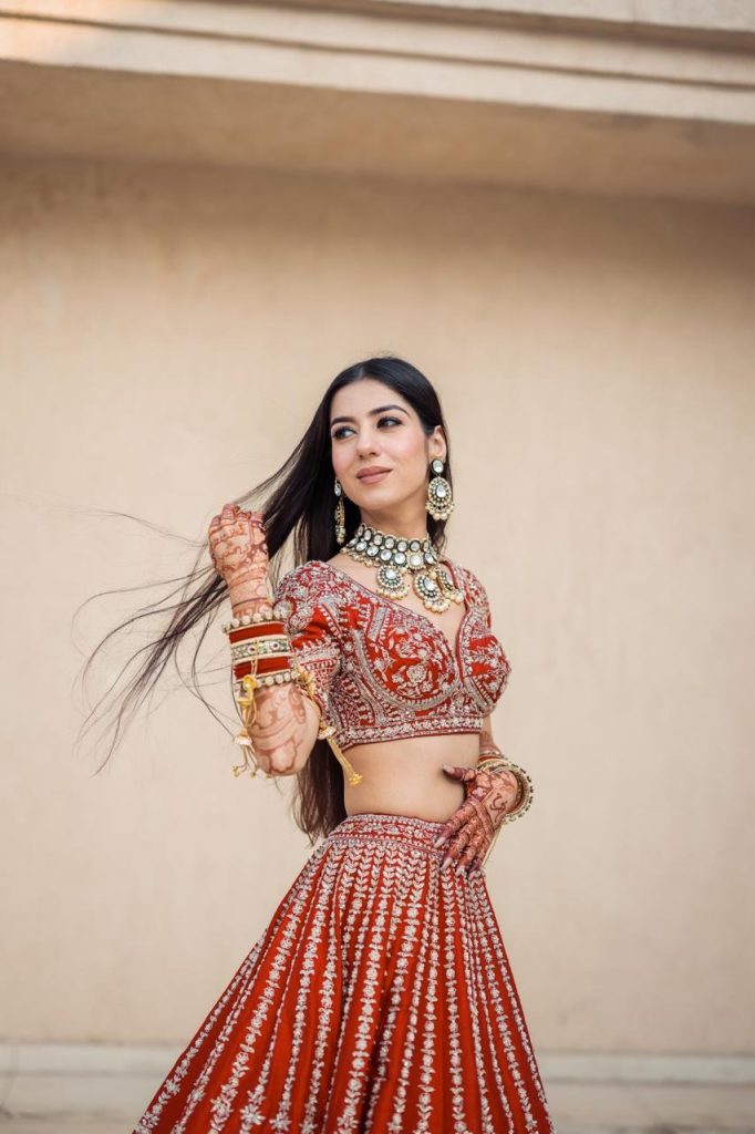 Here is a bride who didn’t just wear a lehenga, she felt it. A soft swirl of red as she twirled. A shy smile she couldn’t hide. A quiet glow that came from knowing she had stepped straight into the version of herself she had imagined for years.