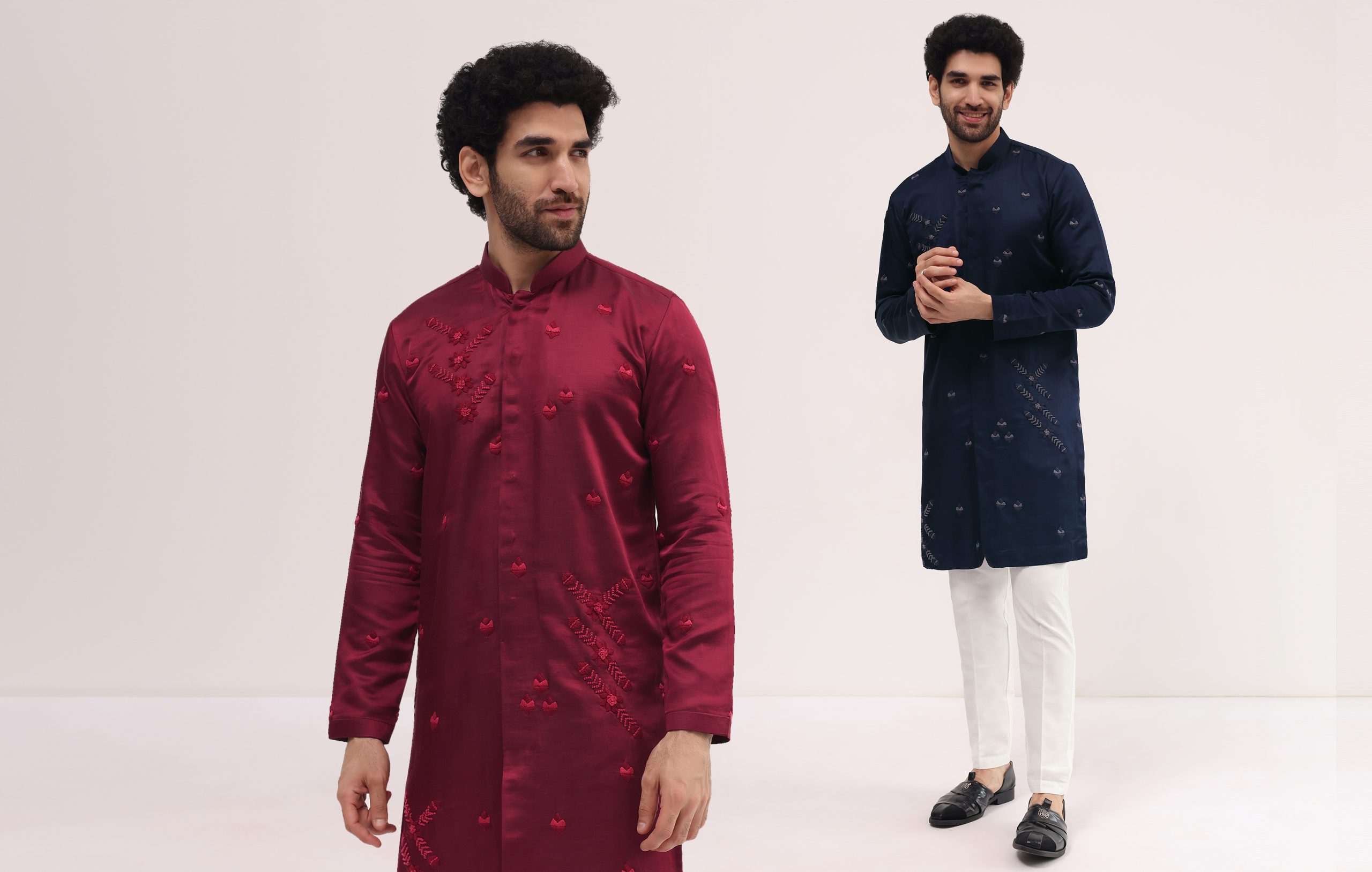 If you are someone who believes in the less is more motto and likes to wear elegant kurtas with minimalistic embroidery or embellishments, embrace classy kurtas in luxurious fabrics like silk, organza, brocade etc that give a regal look and make you look festive ready. The sheen and smooth texture of these fabrics make them a coveted choice for festive celebrations. Pair the green tussar kurta pyjama for men with a watch, a stole, and mojaris to complete your look.