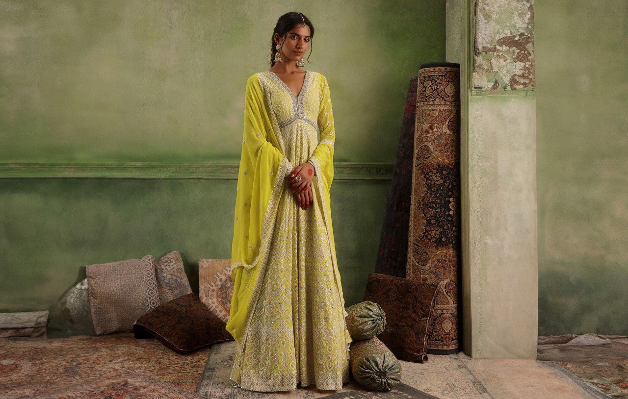 While playing with the trendy pattern of this beautiful palazzo suit from KALKI, you can also manage the harmony of colours. The teal green and the yellow shade of the salwar kameez look very much clashing but friendly to create an interesting mix for your ethnic world. The two-colour schemes can work in your favour and add an extra layer of visual interest for the onlookers.
