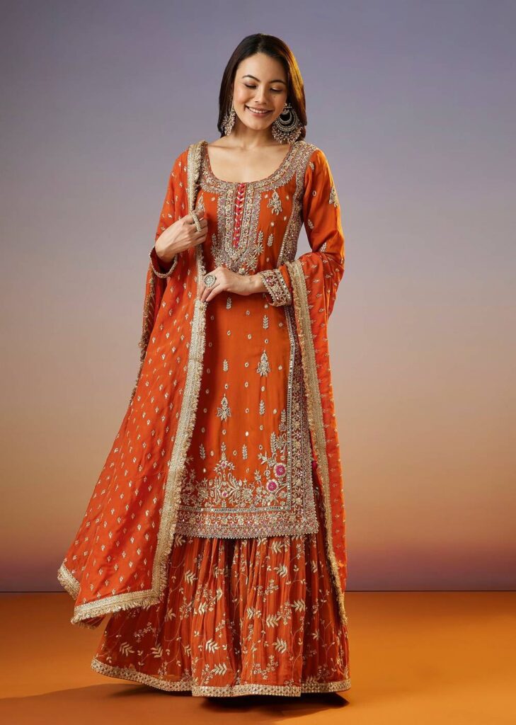 Orange Zardosi Sharara Suit With Organza Dupatta