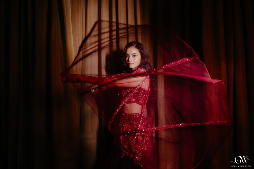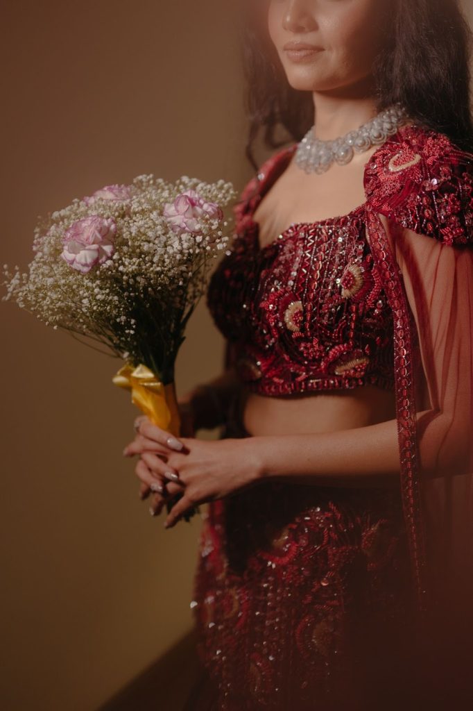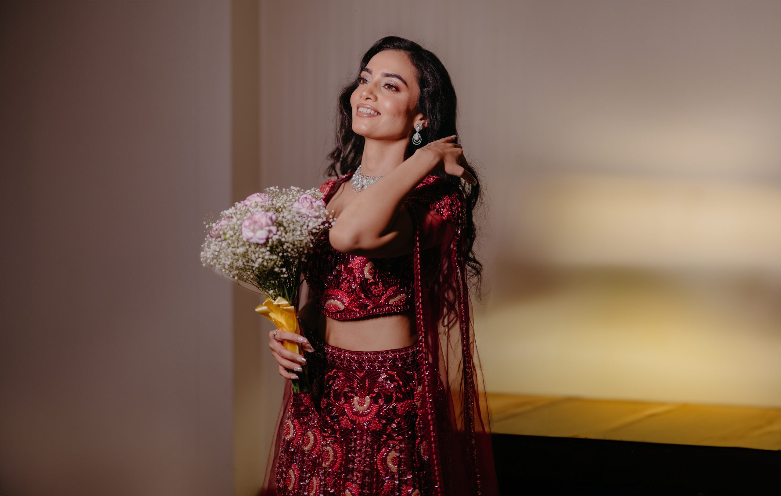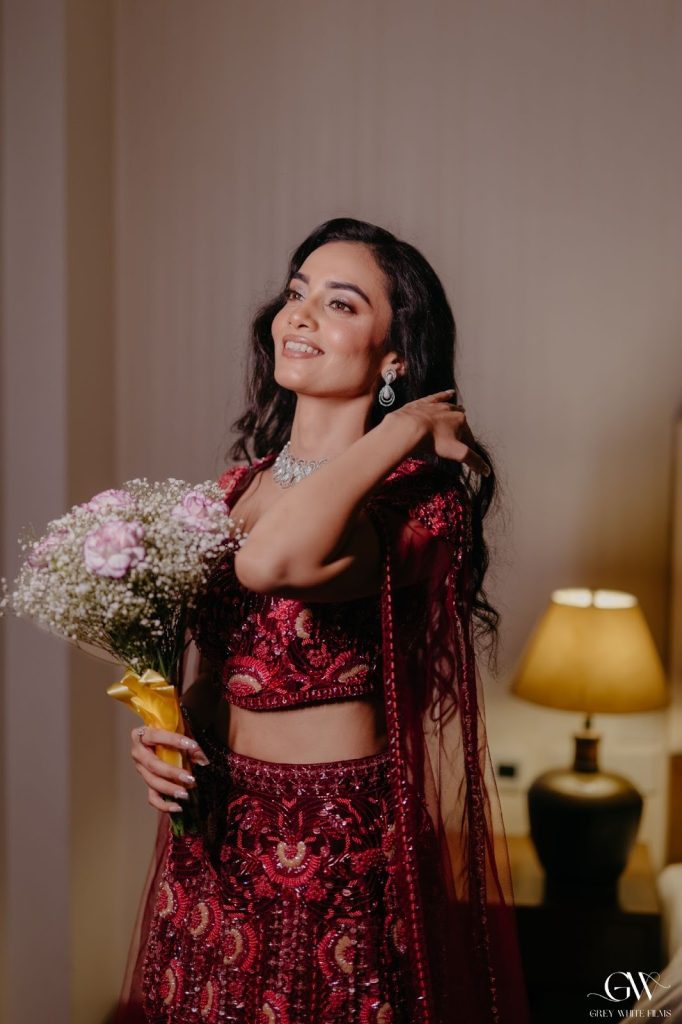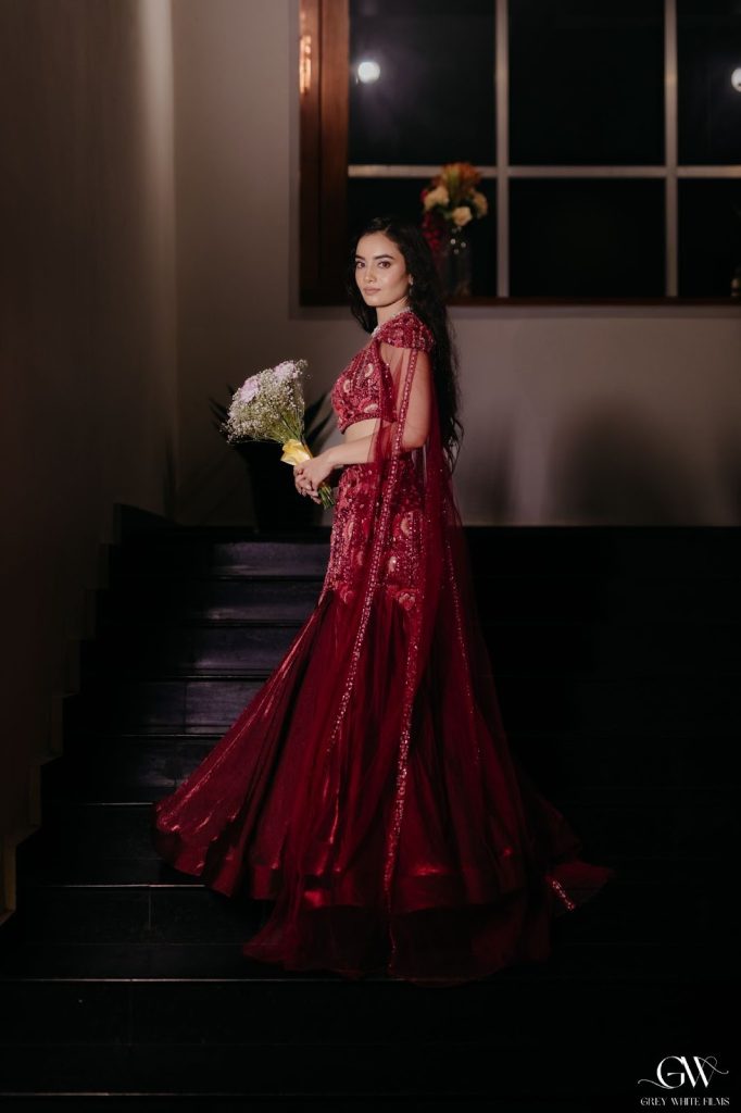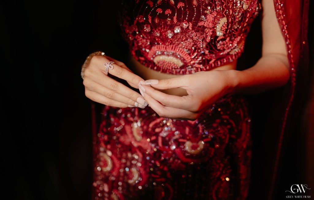 The rich maroon palette immediately evokes warmth and depth—colours often associated with love, commitment, and passion. Unlike brighter bridal reds meant for the main ceremony, this shade feels more relaxed, more personal. It is a colour that doesn’t demand attention but commands it quietly.