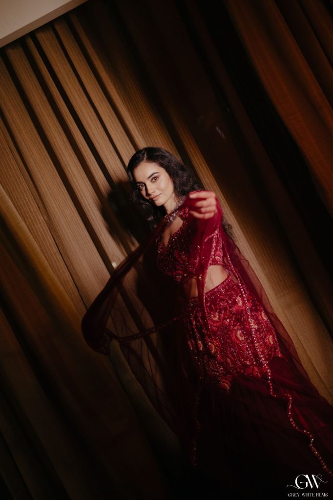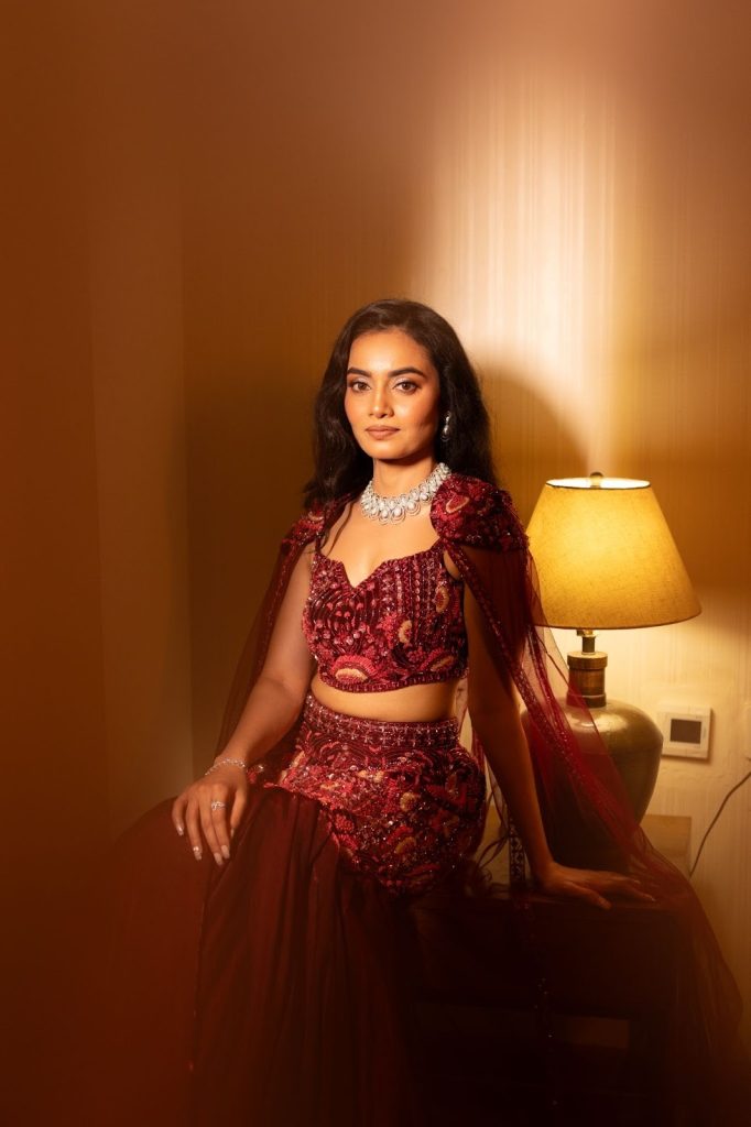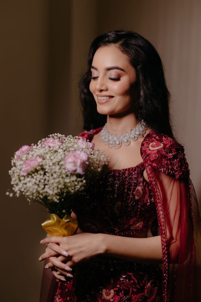Dressed in a deep wine-hued ensemble, the bride steps away from the ceremonial spotlight and into an evening that celebrates her. This is not about rituals or traditions—it is about presence, confidence, and the soft glow of newlywed joy. The outfit feels perfectly suited for a wedding reception, bridal cocktail evening, or an intimate after-party, where elegance meets ease.